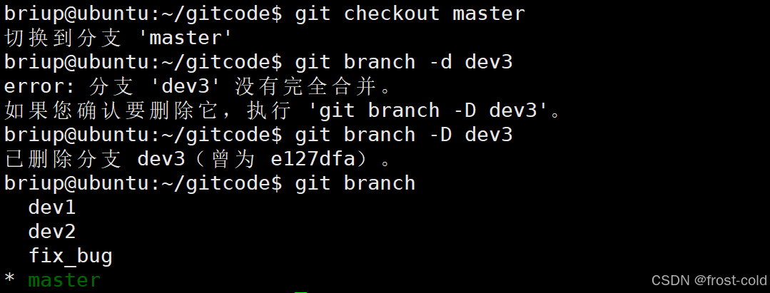 此时我们切换到 master 分支进行删除 dev3,但是此时我们使用命令