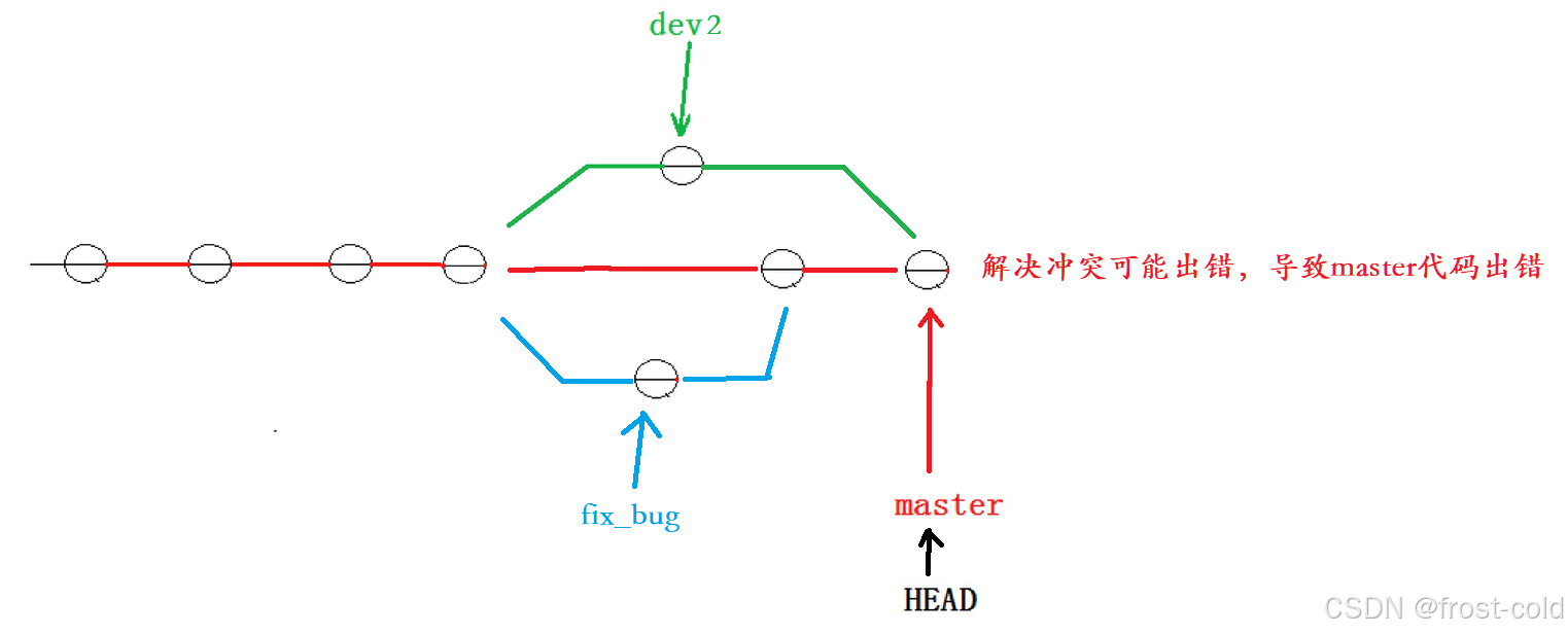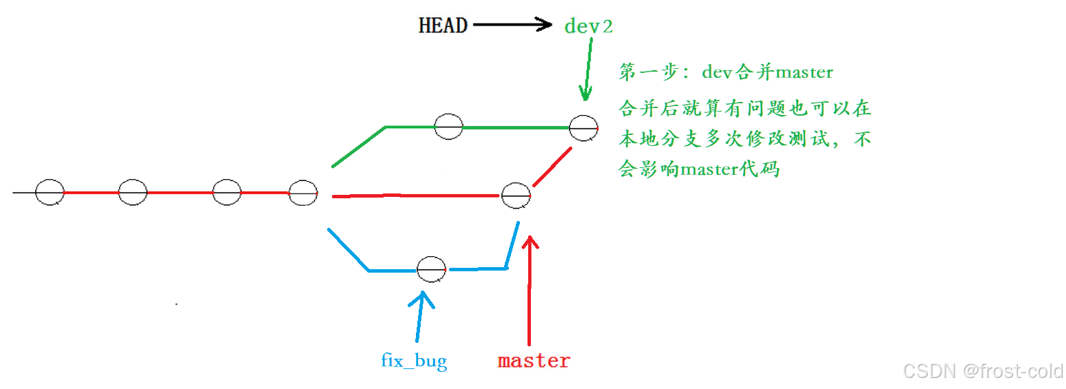所以我们应该先在 dev2 上进行合并,这样子就算发生冲突进行修改也不会影响 master 代码