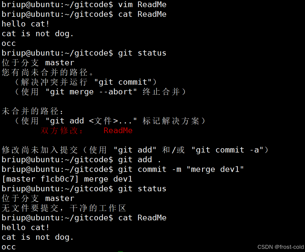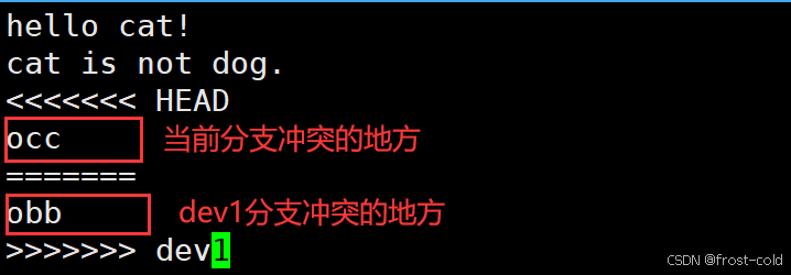 假如说 ReadMe 文件原来是 okk,分支 master 对 ReadMe 文件修改是 occ,分支dev1 对 ReadMe 文件修改为 obb,那么此时将两个分支合并,此时合并之后的文件是什么样的,这时会产生分支冲突。