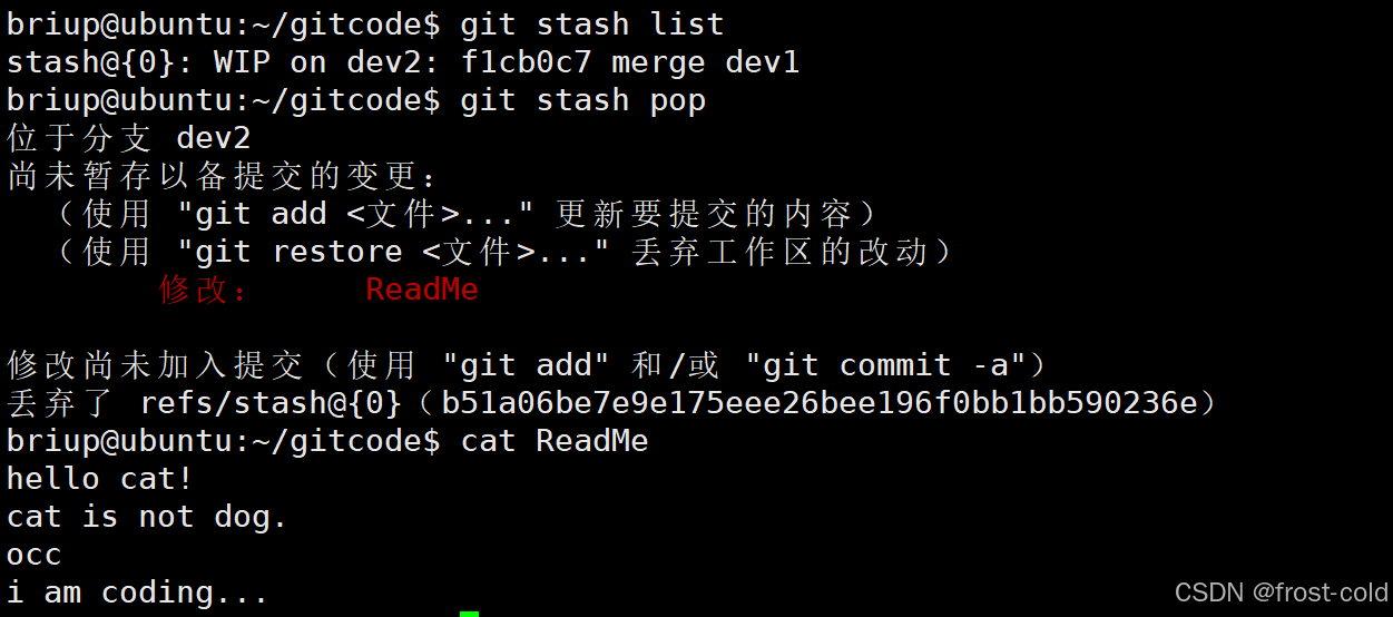 修改完 bug 后我们切换到 dev2 进行开发,我们发现开发的代码不在里面,这是因为在上面被放到了 stash 里面。