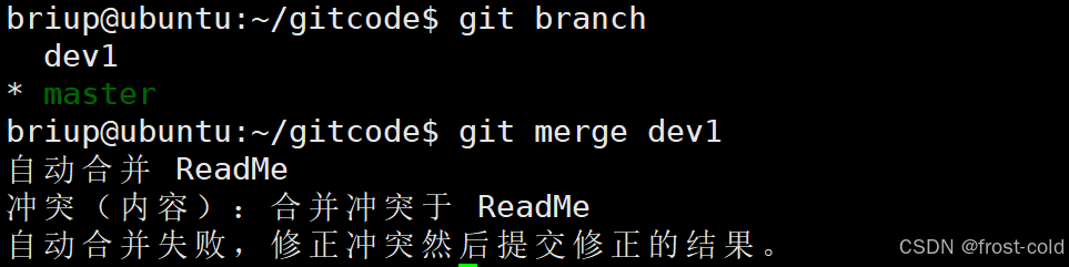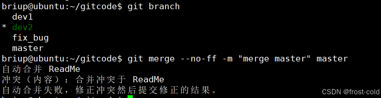 接下来按此方法进行操作,将 master 合并到 dev2,发生合并冲突