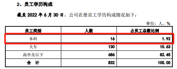 截至2019年末、2020年末、2021年末、2022年6月末,芯微电子的员工人数分别为486人、608人、779人、832人。从2022年上半年的情况看,芯微电子共拥有16名员工的学历在本科,130名员工的学历在大专,686名员工的学历在高中及以下。换言之,芯微电子98.08%的员工的学历在本科以下。与此同时,公司拥有89名研发人员,这也意味着,若16名芯微电子学历在本科的员工为研发人员,其仍然有82.02%研发人员的学历在本科以下。有关上述问题,钛媒体 APP 发函至公司,但截至截稿,没有收到公司的回复。(本文首发于钛媒体** APP**,作者|邓皓天)