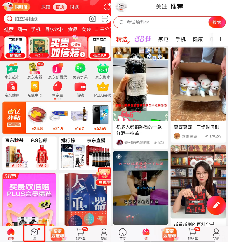 相比淘宝,京东做内容显得有些犹豫,投入也有限。目前,京东首页底部第二栏为短视频入口“逛”,由以往内容产品(平台)“种草TV”“闪电智能内容创作平台”等整合而来,兼具图文、短视频以及直播等内容。