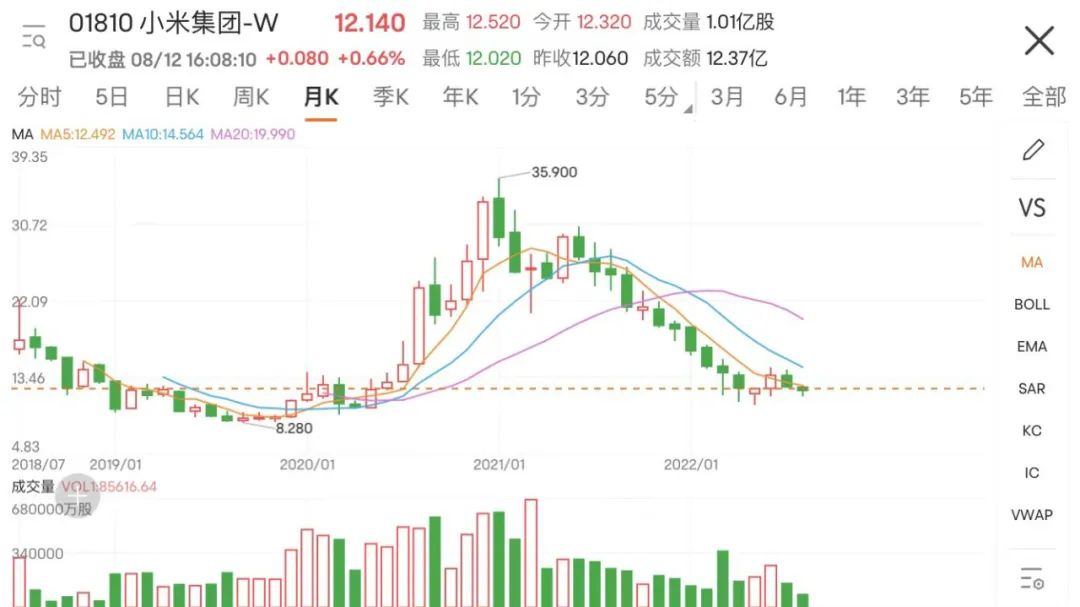 从月线级别来看,小米自2021年初达到股价最高点后,中间已有14个月收阴。即使在今年5-6月多家主机厂股价暴涨的情况下,仍未止住下滑的趋势。