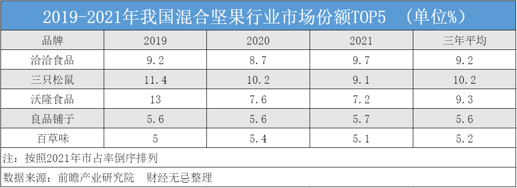 根据前瞻产业研究院的一组调研数据显示,2019年以前,沃隆在混合坚果行业中市场份额最高,2019年达到13%,位居行业第一;2020年市场份额为7.6%,行业排名第三;2021年市场份额为7.2%,行业排名第三。