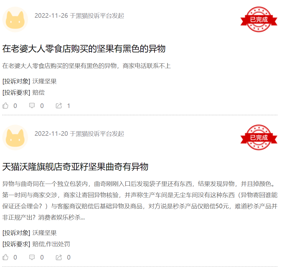 这一点从很多方面能看出端倪,比方说,相对于代工厂模式,自建工厂拥有对产品质量更好的把控能力,但沃隆的投诉却始终居高不下,诸如“果仁出现黑色异物”、“坚果中吃出虫子”、“保质期内哈喇变质”、“面包里有头发”等负面,与“沃隆只做好坚果”的定位是不符的。