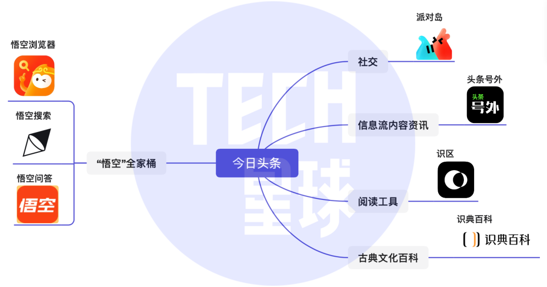 Tech星球梳理统计发现,从2021年开始,今日头条就在不断探索新的业务,不仅推出头条号外、识区、识典百科等新式内容产品,也跨领域地尝试虚拟社交,并推出“派对岛”产品,最重要的是孵化“悟空系”品牌,打造悟空浏览器、悟空搜索,以及未上线的悟空问答等内容产品矩阵。