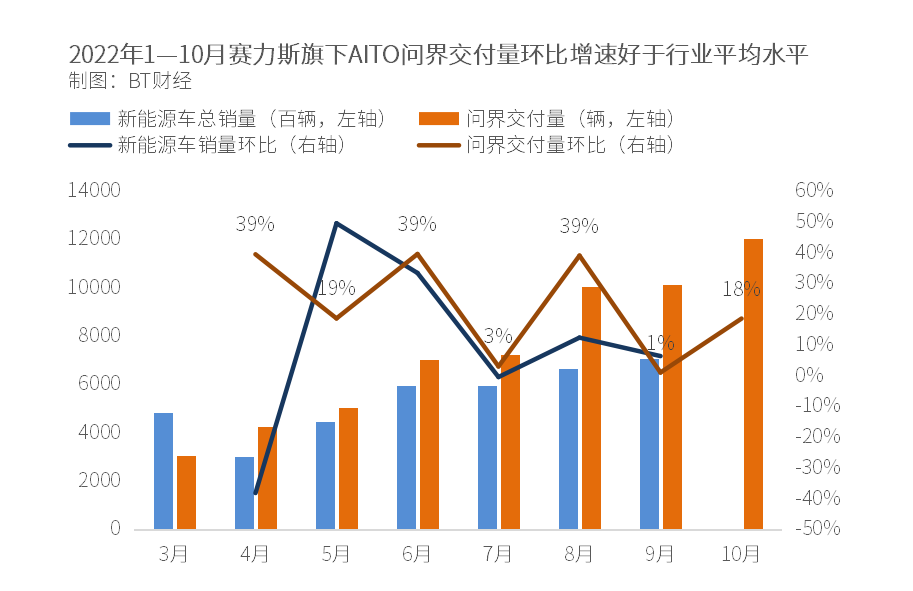 看完了“绝对增量”,我们再来看看“相对增速”——我们都知道,新能源车在2022年整体都迎来了销量攀升,那么赛力斯的增长在其中算得上优秀吗?它跑赢行业平均水平了吗?