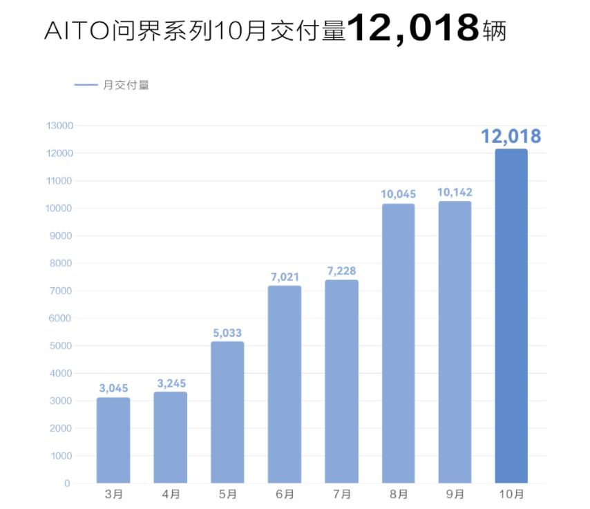 我们来看看赛力斯旗下AITO问界的销量情况,从3月到10月,交付量稳步爬坡,其中重要的时间点包括3月M5用户交付启动仪式在上海开启、7月M7上市、9月M5 EV纯电版上市。