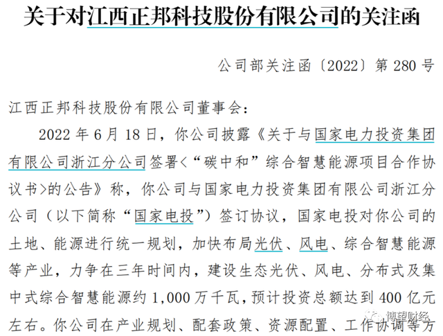 6月18日,正邦科技披露的《关于与国家电力投资集团有限公司浙江分公司签署<“碳中和”综合智慧能源项目合作协议书>的公告》称,公司与国家电力投资集团有限公司浙江分公司(以下简称“国家电投”)签订协议,国家电投对公司的土地、能源进行统一规划,加快布局光伏、风电、综合智慧能源等产业,力争在三年时间内,建设生态光伏、风电、分布式及集中式综合智慧能源约1000万千瓦,预计投资总额达到400亿元左右。