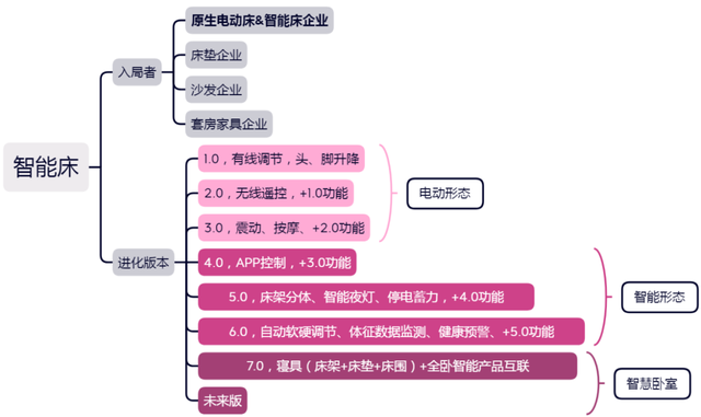 最早期的智能床跟大众理解的电动床类似,可以通过手动遥控实现升降功能,但床上没有传感器监护,床垫不能自行调整,这种“电动模式”是智能床的早期形态。