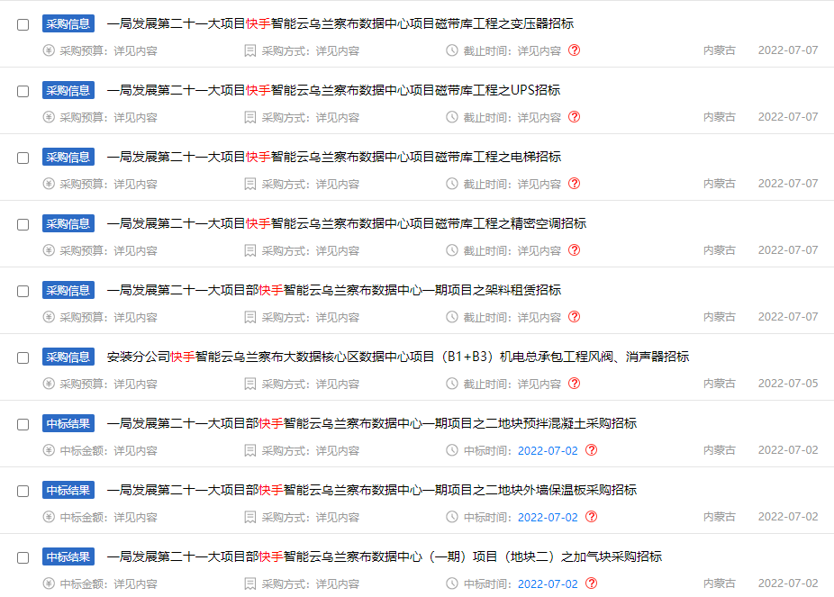 (快手智能云乌兰察布数据中心招标情况 图源:采招网)