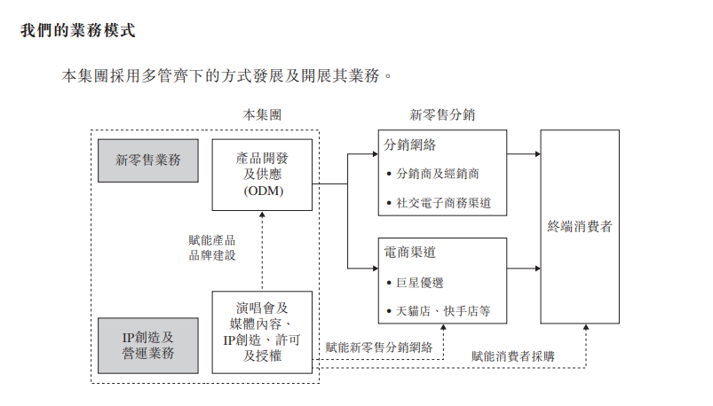 巨星传奇有两大主要业务,分别为IP创造及营运、新零售业务。其中,IP创造及营运的业务中,主要通过为媒体内容提供策划及其他项目管理服务、担任大型明星演唱会及其他活动的策划服务供货商或投资方以及设计、授权专有明星IP,以及创造独有明星IP。
