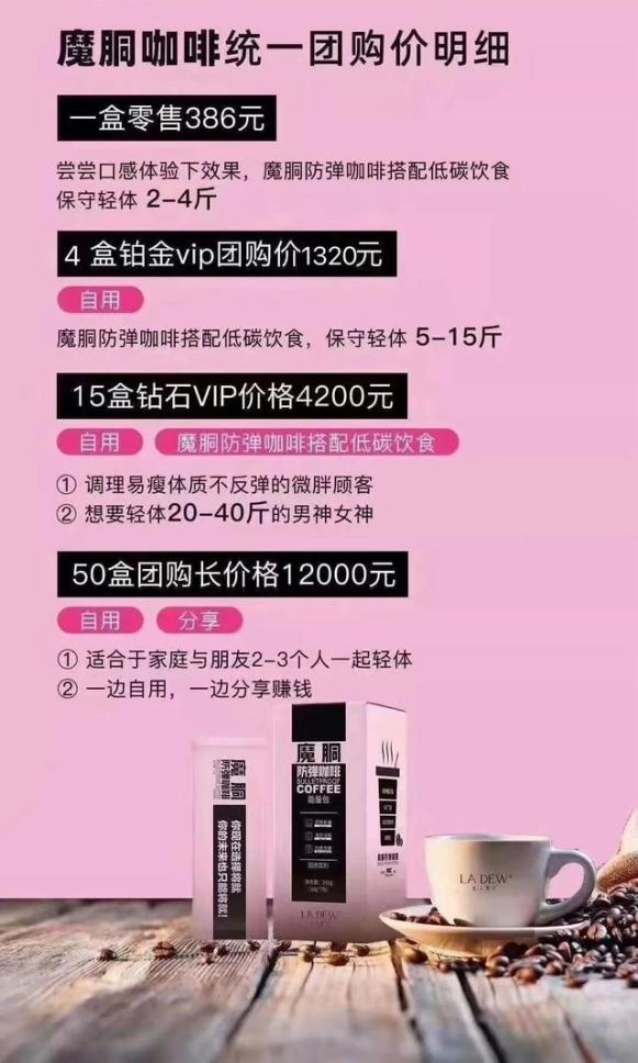 3.打着周杰伦的旗号吸引加盟,并建立了庞大的分销网络之后,魔胴咖啡实际上已经不需要面向消费者,它只需要赚分销商与经销商的钱即可,但经过多层分销体系的催化,采购单价仅为20元左右一盒的魔胴咖啡,到了消费者的手里却可能怒翻17倍。