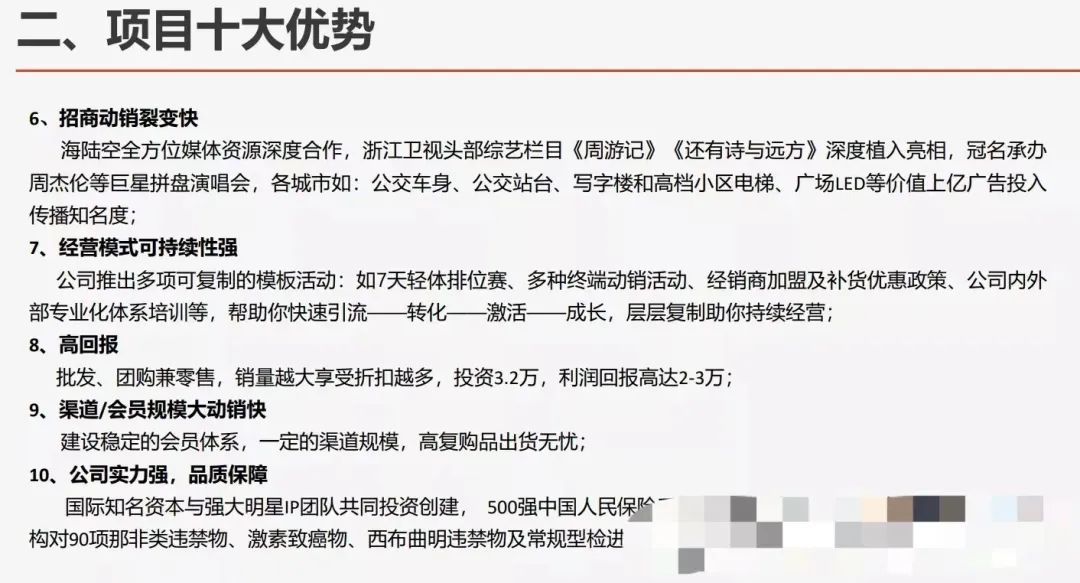一位代理商向凤凰网科技展示的招商项目书中,列举了十项代理优势。其中,第六条写道:海陆空全方位媒体深度合作,浙江卫视头部综艺栏目《周游记》《还有诗与远方》深度植入亮相,冠名承办周杰伦等巨星拼盘演唱会;第十条则写到,国际知名资本与强大明星IP团队共同投资创建。