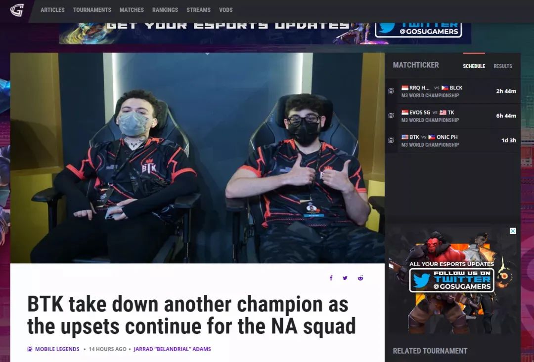 北美地区激增的营收和用户数据也直接体现到了其竞技实力中,在去年年底的M3比赛中,来自北美的战队BTK,在首次参与全球冠军赛的背景下,接连战胜了两支夺冠热门队伍——两届菲律宾MPL冠军Blacklist International和两届新加坡MPL冠军EVOS SG,并闯入三强,打破了东南亚战队包揽全球冠军赛四强的神话。