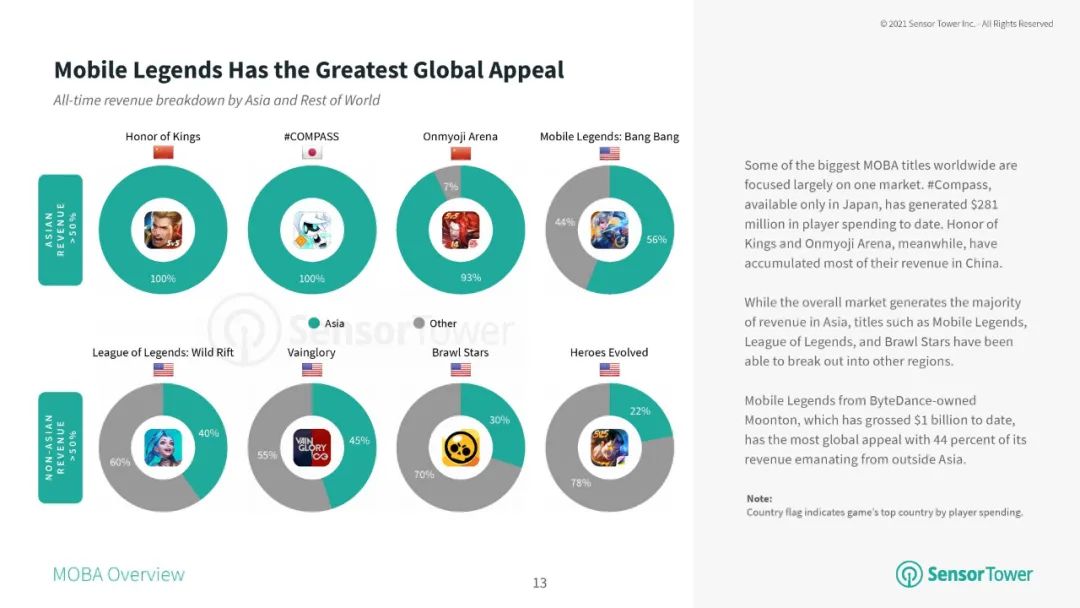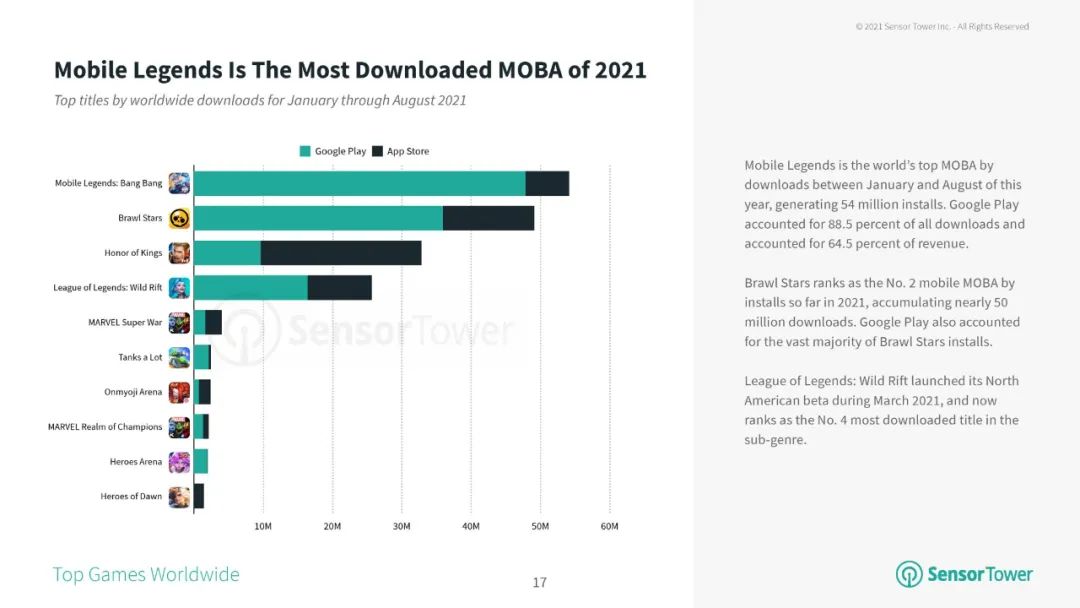 当这些直接体现到数据维度上,在2021年,MLBB的全球月活用户突破1亿,在2021年仅1-8月份,超过5000万下载位列全球MOBA第一(不算中国大陆地区数据),并产生了超过2亿美元的营收。