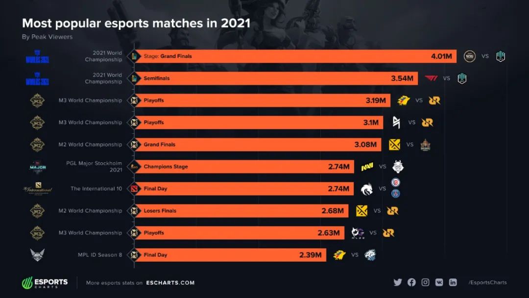 根据国外数据统计网站Esports Charts针对海外直播平台的相关数据统计,在2021年观看人数峰值排名前10的单场MOBA电竞比赛中,MLBB的相关赛事独占6席(均为东南亚队伍间的对决)。