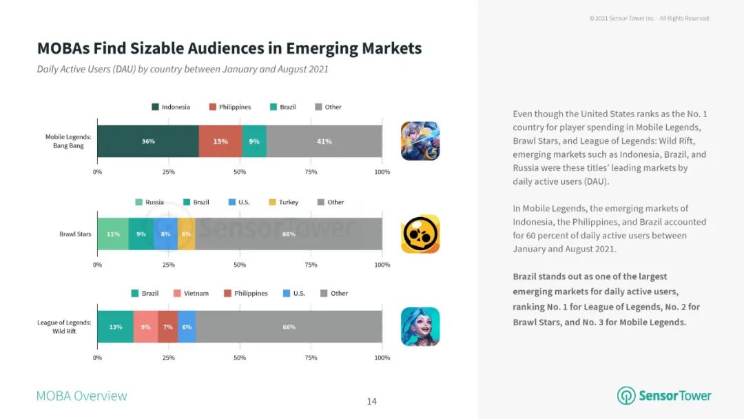 向这些地区的拓展为MLBB在市场的多元化上提供了直接的助力,目前在MLBB的DAU组成当中,巴西市场是继印尼和菲律宾之后占比第三高的市场。