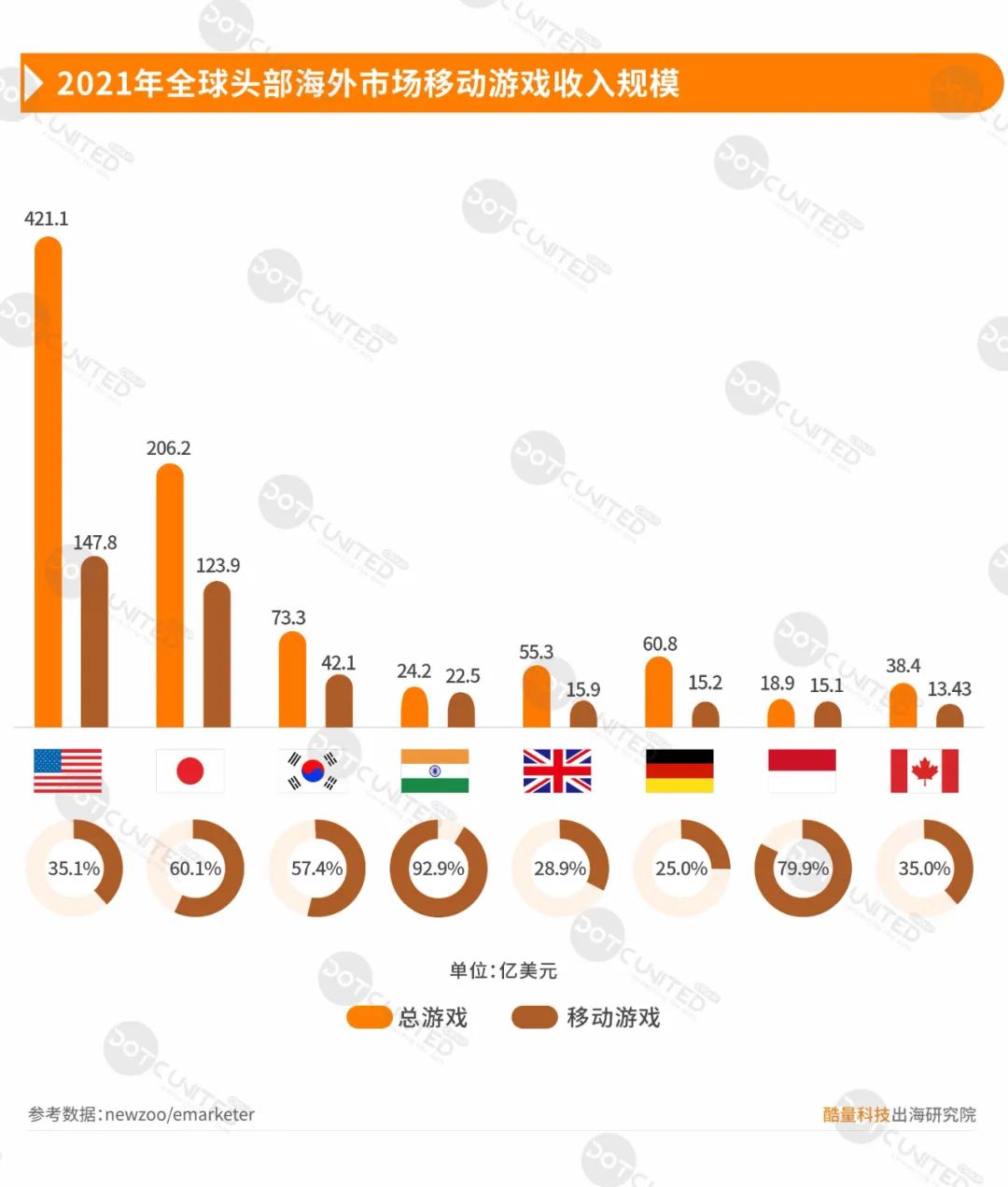 Newzoo的数据显示,在2021年,美国移动游戏市场的收入为147.8亿美元,日本移动游戏市场的收入为123.9亿美元,是仅次于中国且超过100亿美元收入的两大市场。