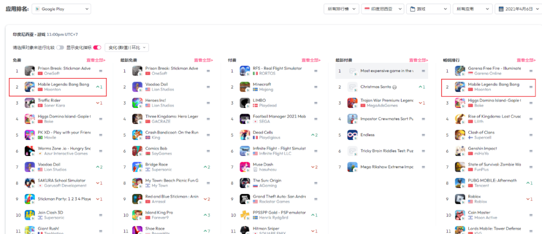 拿下海外最佳MOBA,MLBB最大的倚仗是其在东南亚市场的出色表现,在印尼、马来西亚、新加坡、菲律宾等东南亚地区,MLBB都有着极其出色的表现,畅销榜常年位居TOP3。