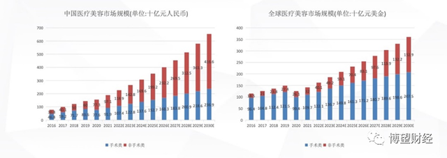 据亿邦数据显示:截止2021年12月,中国医美市场从2016年的776亿人名币增加到2021年1890亿元,年复合增长率19.4%,预计2030年将达到6535亿元,全球医美市场规模从2016年的1149亿美元增加至2021年1417亿美元,年复合增长率为2.2%,预计2030年将达到3604亿美元。