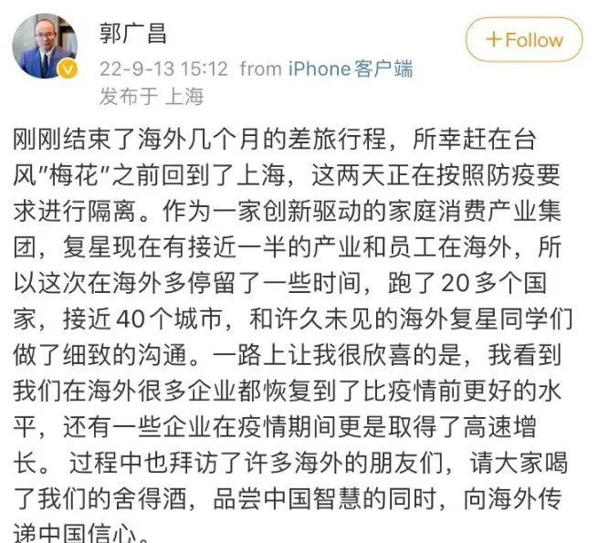 9月14日,复星集团董事长郭广昌紧急从国外返回上海。