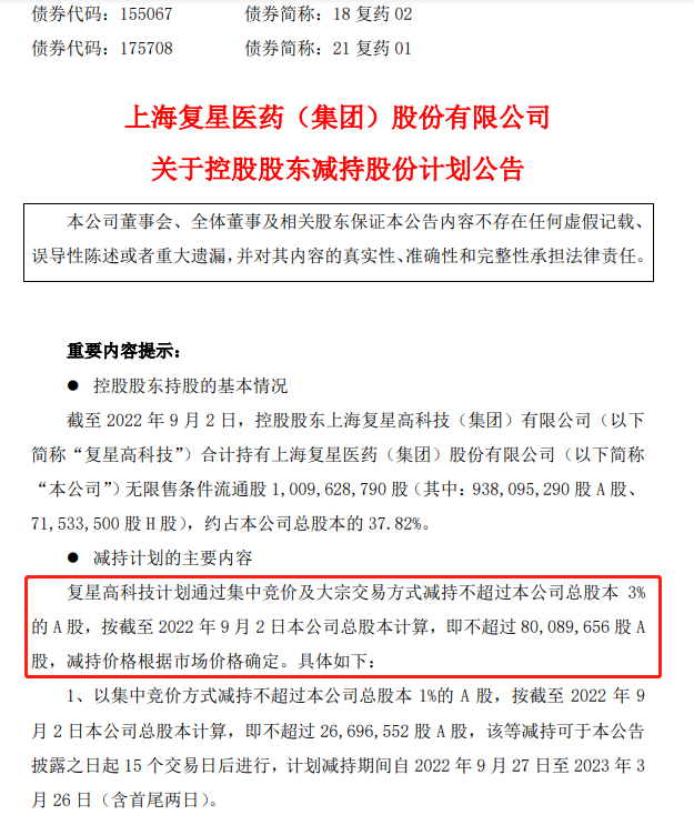 复星医药公告,9月2日晚,控股股东复星高科技拟减持不超过公司总股本3%的A股。这并不是近期复星系的首次减持,2022年前8月,复星系已陆续减持了海南矿业、中山公用、泰和科技、青岛啤酒等上市公司股权,上半年累计套现超过60亿元。