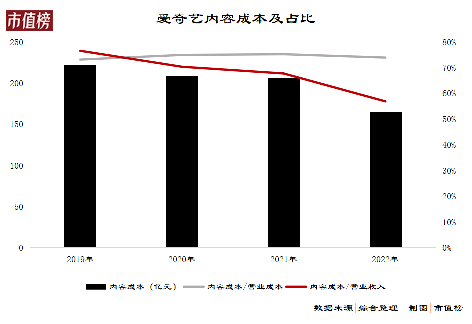 2022年,爱奇艺的内容成本降了20%到165亿元,占总成本的比重在74%左右,占收入的比重为57%。