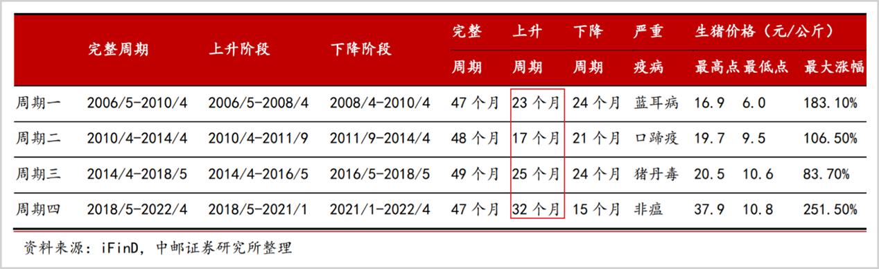从历次猪周期来看,猪价的上升周期均在17个月以上,对应的是能繁母猪从补栏到出栏,大约需要18个月的时间。