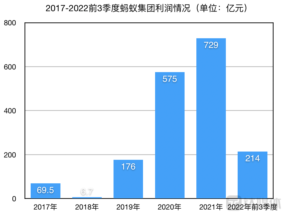 根据阿里巴巴持有蚂蚁集团33%股权比例推算,蚂蚁集团2022年三季度的净利润约30.5亿元,去年同期则为176亿元,同比大幅下滑83%。此外,蚂蚁集团2022年第一季度净利润约为112亿元,同比下降约18%;第二季度净利润约为72.48亿元,同比降约63%。