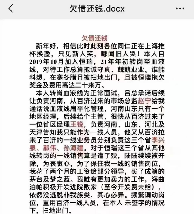 一张疑似前销售员工讨薪的截图在网上流传,该员工声称“为了保住销售岗位,花了两个月的工资给部分领导买了成箱的茅台及梦之蓝”,但最终“在寒冬腊月被扫地出门,且被恒瑞拖欠奖金及费用高达二十来万”。