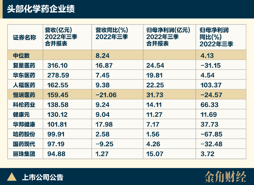 2022年前三季度,恒瑞医药实现营收159.45亿,在头部化学药企中排第四;实现归母净利润31.73亿,在头部化学药企中排首位。