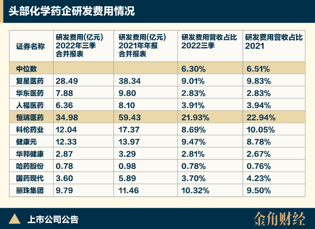 2021年和2022年前三季度,恒瑞医药的研发费用高达59.43亿和34.98亿,均高居头部化学药企首位;