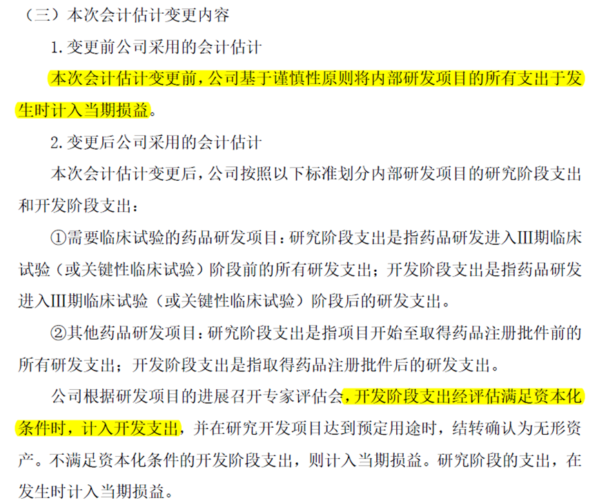恒瑞医药在变更公告中称,公司根据研发项目的进展召开专家评估会,开发阶段支出经评估满足资本化条件时,计入开发支出。