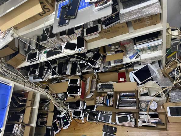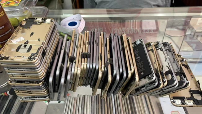 桌上是新到货的手机配件,桌下是一排排的手机,一个放满的柜台,价值能到千万(图源受访人)