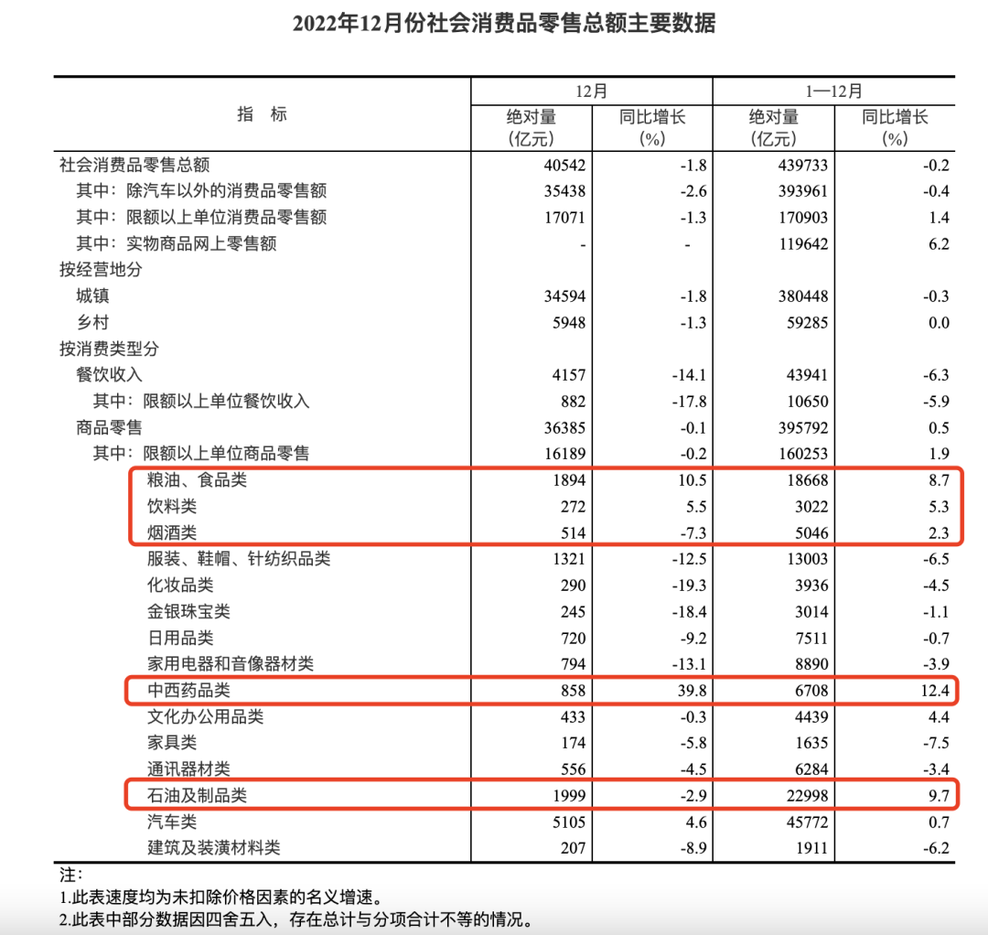 结合国家统计局公布的最新数据来看,2022年社会消费品零售总额439733亿元,比上年下降0.2%,扣除通货膨胀因素,只比2019年疫情前的同期数值仅增长了0.87%。分布到商品类目中,仅有食品饮料、烟酒等快消品还保持着良好增长势头,这也是过去新消费品品牌较为集中的领域,医药、石油及制品类考虑到疫情和原材料涨价等因素,就不展开了。此外,去年餐饮消费同样惨遭“滑铁卢”,2022年全国餐饮收入43941亿元,同比下降6.3%。