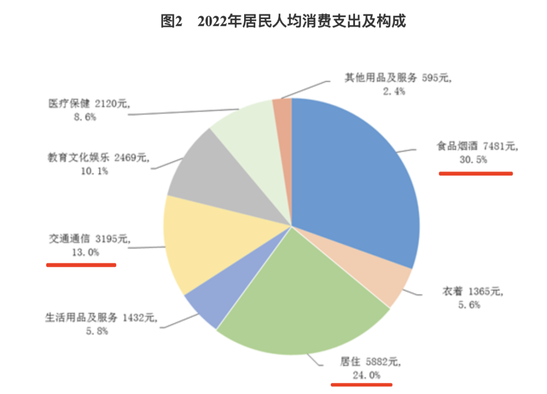 今年随着各项政策调整,只要后续疫情不大面积复发,各类消费会有所回升,但在短时间内很难恢复到往年的强劲势头,这方面做消费品创业的小伙伴要做好“持久战”准备。****因为,中国不缺产能,缺的是市场需求持续增长,而这由消费者主导,人均可支配收入、对经济的发展预期、消费习惯等为主要因素。国家统计局的数据显示,2022年全国居民人均可支配收入36883元,扣除价格因素,同比增长2.9%;在人均消费支出及构成方面,吃、住、行分别以30.5%、24%、13%的占比排名前三。