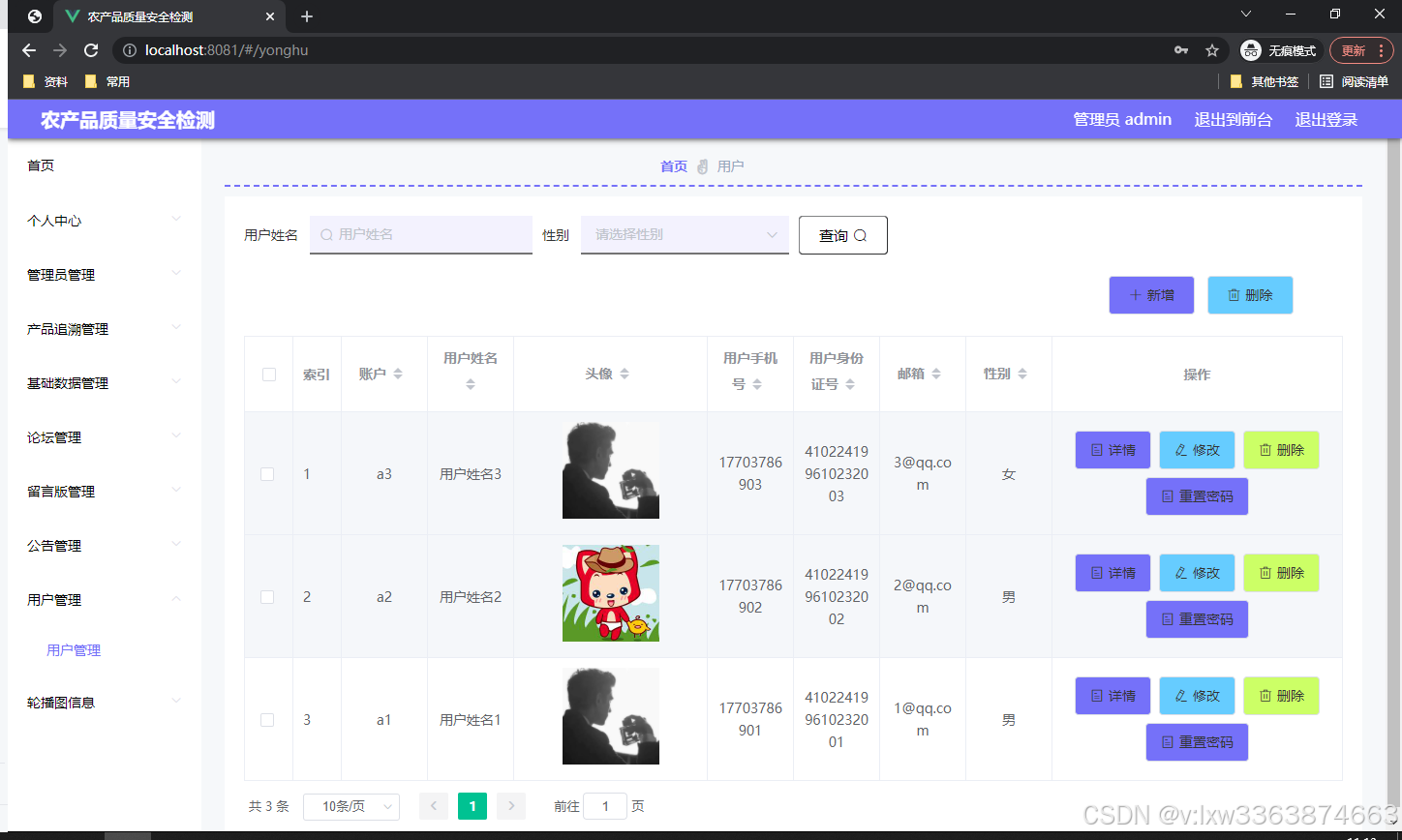 农产品质量安全检测网站可以对农产品质量安全检测网站信息进行集中管理,可以真正避免传统管理的缺陷。农产品质量安全检测网站是一款运用软件开发技术设计实现的应用系统,在信息处理上可以达到快速的目的,不管是针对数据添加,数据维护和统计,以及数据查询等处理要求,农产品质量安全检测网站都可以轻松应对。所以,农产品质量安全检测网站的运用是让农产品质量安全检测网站信息管理升级的最好方式。它可以实现信息处理的便利化要求,还可以规范信息处理的流程,让事务处理成为管理人员手中的一件简单事,而不是之前手工处理时的困难事。尽管农产品质量安全检测网站具备较完善的功能,但是也需要管理人员利用闲暇时间提升自身素质以及个人能力,在操作农产品质量安全检测网站时可以最大化运用农产品质量安全检测网站提供的功能,让系统在满足高效率处理数据的同时,也能始终稳定运行,还可以确保数据的可靠性与数据处理的质量。