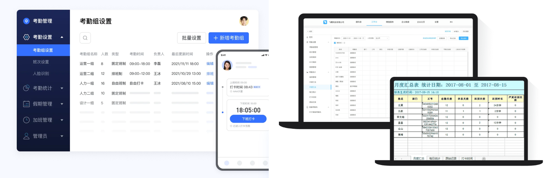 以考勤功能为例。飞书的系统除了包括设置考勤组、班次和考勤统计等常规功能外,还有假期管理、加班管理、精确到分钟的出勤时间统计和自定义请假规则等功能,甚至配套了智能化考勤机和门禁机。