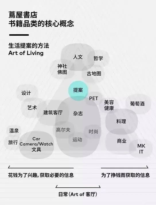 在官网上,茑屋书店用“生活方式提案型书店”来标榜自己,换句话说,它不是单纯卖书的书店,而是提案生活方式的场所。这就应了茑屋书店的创始人增田宗昭曾经留下的那句脍炙人口的名言: