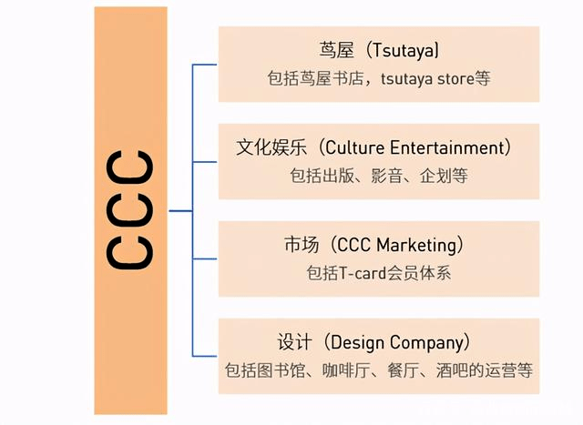 CCC集团(全称Culture Convenience Club)是一家日本体验式零售的领军公司。经过多年发展,已经成为跨多个领域生活提案的策划公司,集团的商业布局主要围绕“生活方式内容(Lifestyle Contents)”、平台(Platform)、数据库(Database)三个关键词展开,旗下主要有四大业务板块,分别是TSUTAYA株式会社、CCC文化娱乐、CCC市场营销公司、CCC设计公司。