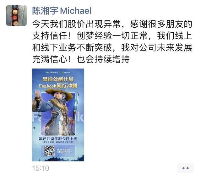 如今,《黑沙》手游在国内由腾讯游戏与创梦天地联合代理发行,但从部分网友的反馈来看,《黑沙》疑似曾在25日晚上将公测时间改为27日,引发一波争议。而创梦天地此次股价闪崩即发生在26日,后来《黑沙》也于26日如期上线,在陈湘宇的朋友圈回应中,配图也是《黑沙》开启公测的海报。