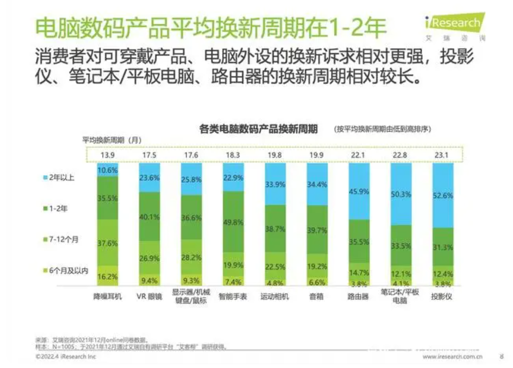同时,“安迪比尔”定律虽然仍有生效,但随着CPU性能的不断提升和基础配置的进一步完善,由于基础体验已经有了较强保证,新旧款Windows笔记本之间的体验差异已经变得不太明显,换机周期也随之拉长。根据艾瑞咨询发布的消费行为报告显示,受访者中超过50%的用户至少使用2年才会考虑更换笔记本电脑,换机周期是所有调查品类中第二长的。