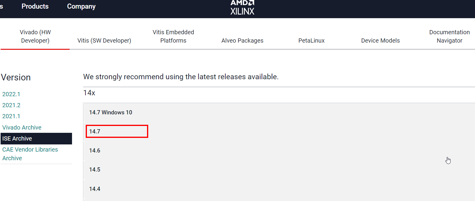 14.7是ISE的最后一个版本,后续版本改名为Vivado,ISE的历史版本3.x-14.x可以在Xilinx官方网站进行下载: