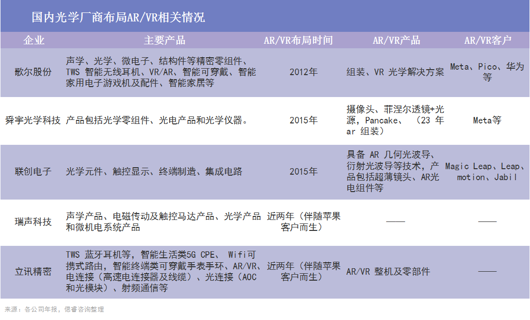 ①行业发展的关键节点,正好将厂商划分为三梯队:歌尔2012年最早入局,独占第一梯队;2015年,第二波风口期,舜宇光学进入,成了二梯队选手;2020年开始,Meta放量,立讯精密、瑞声科技等随风而动,努力追赶。