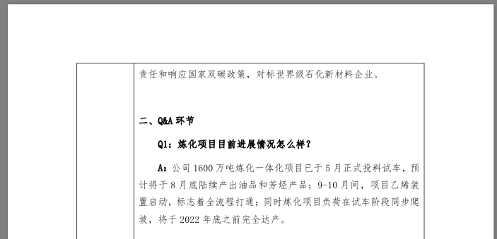 在近期的投资者调研活动中,东方盛虹披露最新进展称,预计将于8月底陆续产出油品和芳烃产品;9-10月间,项目乙烯装置启动,标志着全流程打通;同时炼化项目负荷在试车阶段同步爬坡,将于2022年底之前完全达产。