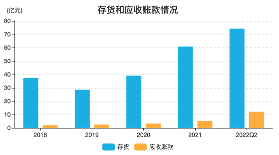 此外,公司的存货节节攀升。数据显示,截至上半年公司存货74.23亿元,同比增加112.39%。拉长时间线看,公司存货已经连续6个报告期持续增加。在此之前,公司2021一季报、半年报、三季报、年报,今年一季报存货金额分别是33.93亿元、34.95亿元、41.50亿元、60.86亿元、69.74亿元。同期公司存货周转天数也在波动上升,到今年上半年,其存货周转率同比下降了1.72%。