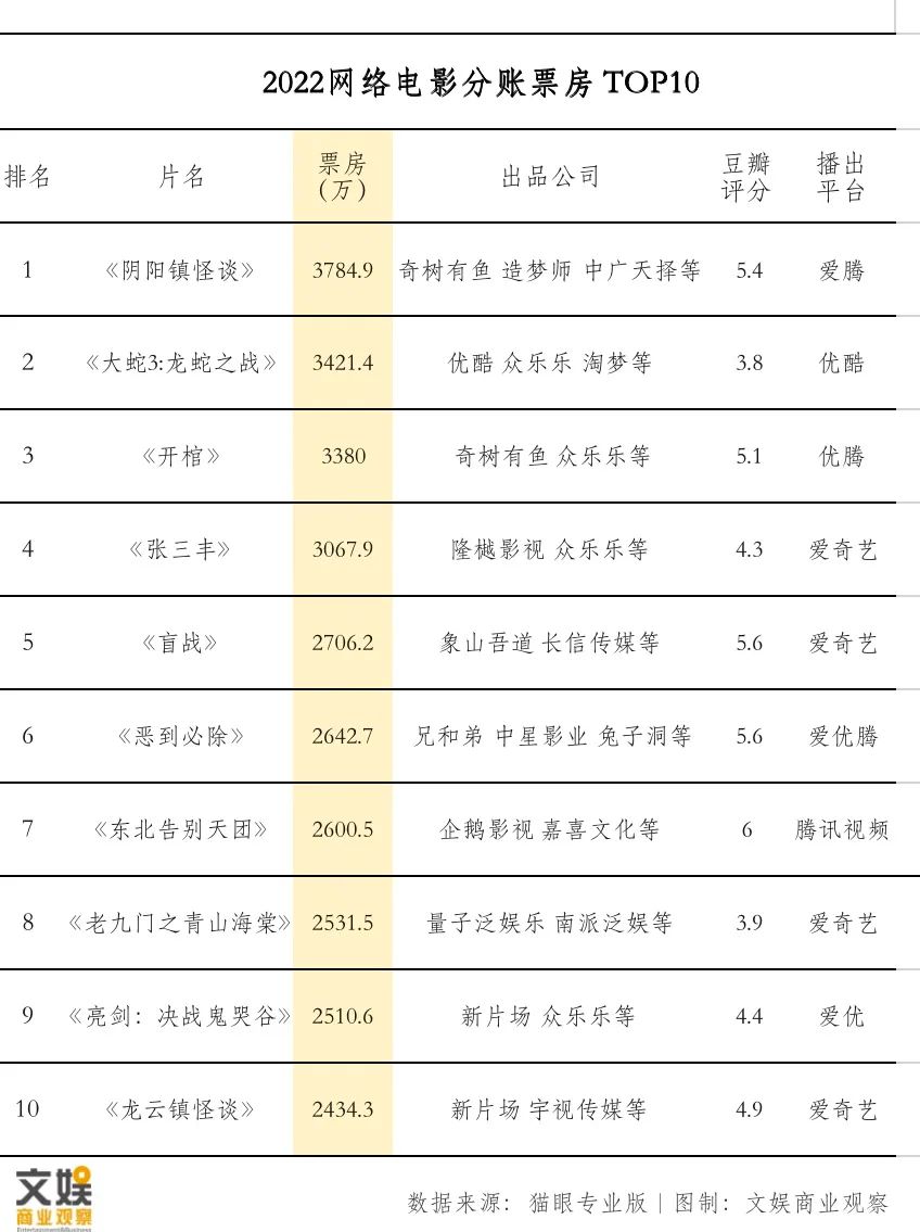 但当下,吾道南来基本已经消失在网络电影的主流话语圈;新片场2022年主控出品的作品中,分账票房最高的《亮剑:决战鬼哭谷》不过2500万出头;而奇树有鱼的《阴阳镇怪谈》《开棺》虽分别拿下2022网络电影分账票房 TOP1和TOP3,但纵向对比,无论是在口碑还是票房层面,奇树有鱼也在后退。
