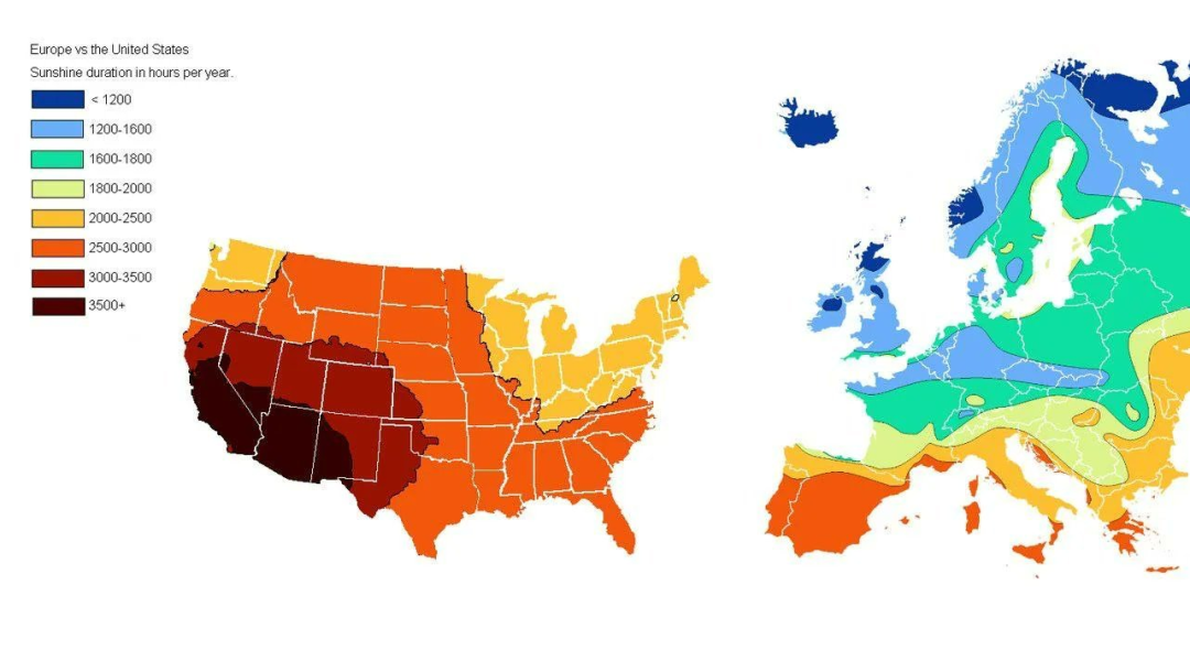与欧洲对比,美国绝大多数区域年光照时长都超过2000小时,而欧洲则完全相反,大多数区域年光照都在2000小时以下。